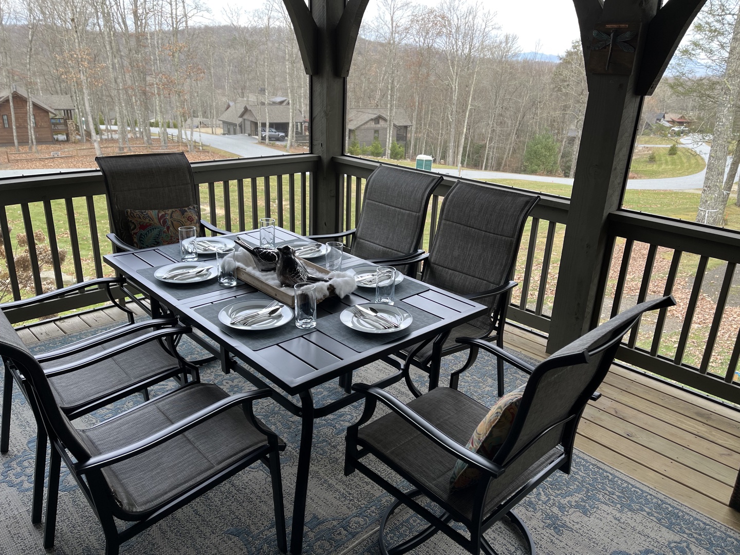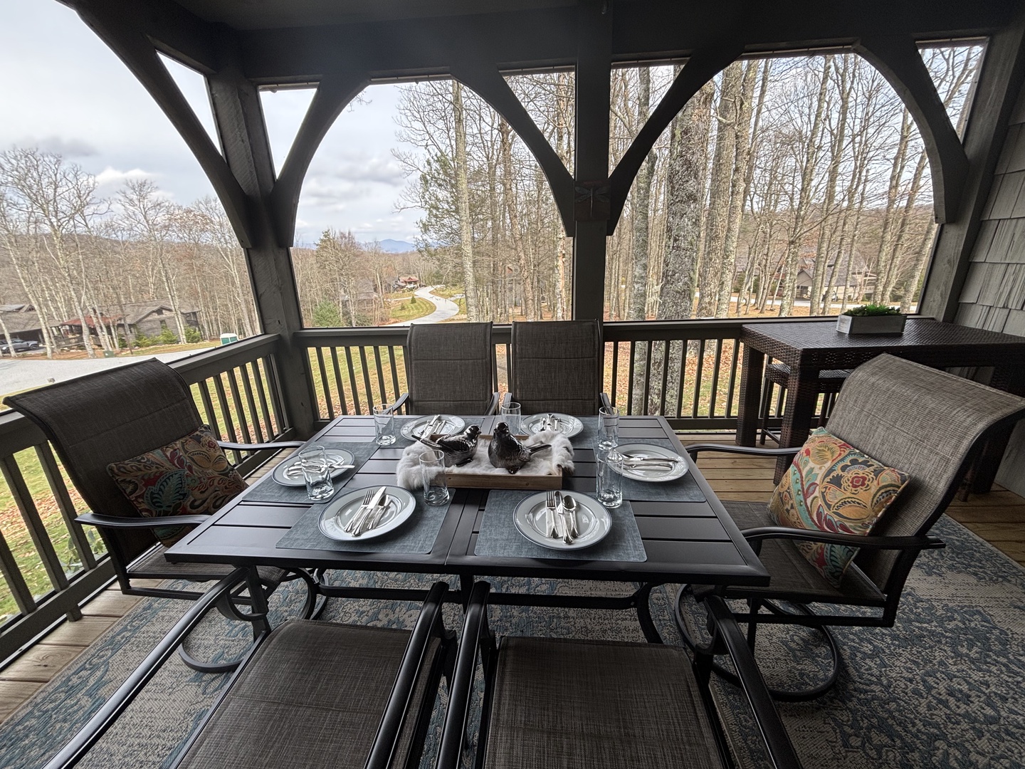 OUTDOOR LIVING: Furnished screened-in porch w/ cushioned patio furniture, outdoor flat-screen TV, wooded views and mountain view. There is a covered front porch with rocking chairs and mountain views, and a covered back/side porch with a gas grill. There are two fire pits (one at the Outpost and on at Tulip Pond) available for your use.
