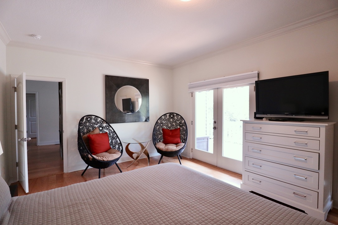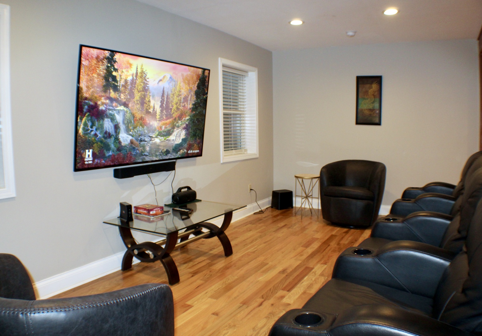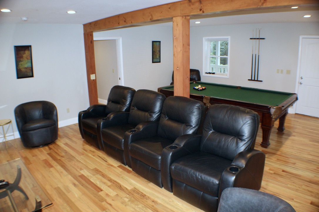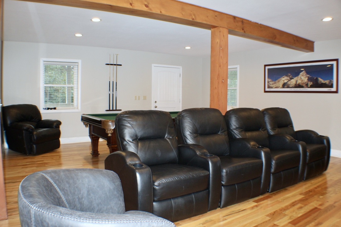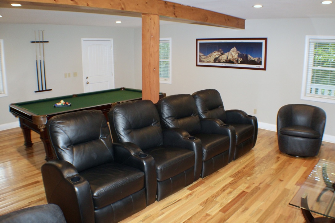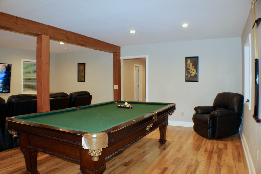 The lower level of the home gives the opportunity for everyone in to hangout and spend time together either playing a game of pool or watching a movie. Here you will also find an additional bedroom with a king sized bed. Across the hall is the sauna room which also has a step-in shower and double vanity. Right past the sauna room, you will step into the media room which offers a large leather couch and a Billiards table. Here you also have access to the lower level deck.