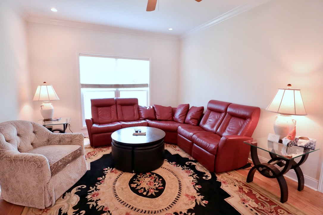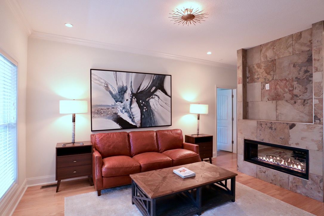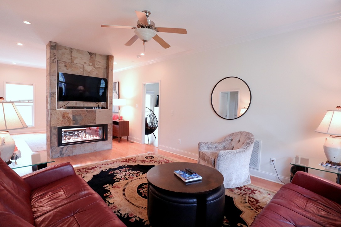 Around the corner, in the center of the main level, are 2 separate living areas divided by a stone pillar gas fireplace. Sink into the large sectional couch while watching TV, or relax with a good book in the sitting area on the other end of the room.